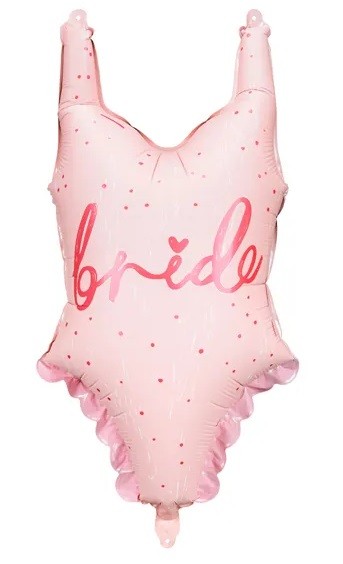 Balon foliowy w kształcie kostiumu kąpielowego.>Z napisem Bride w kolorze różowym. >Wymiary przed napompowaniem ok.46 x 76 cm (18 x 30”)>wymiary po napompowaniu ok. 37 x 68 cm (14.5 x 26.
