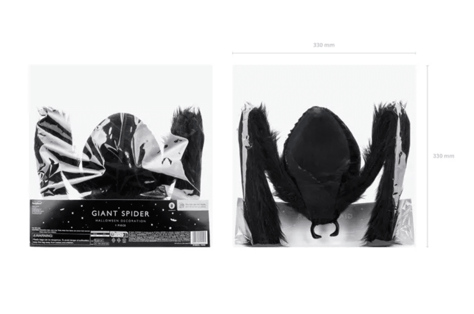 Efektowna dekoracja w kształcie czarnego pająka, idealna do aranżacji wnętrz i ogrodów na Halloween. Po rozłożeniu osiąga wymiary ok. 103 x 75 x 9 cm, a długość nóg to aż 60 cm!