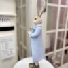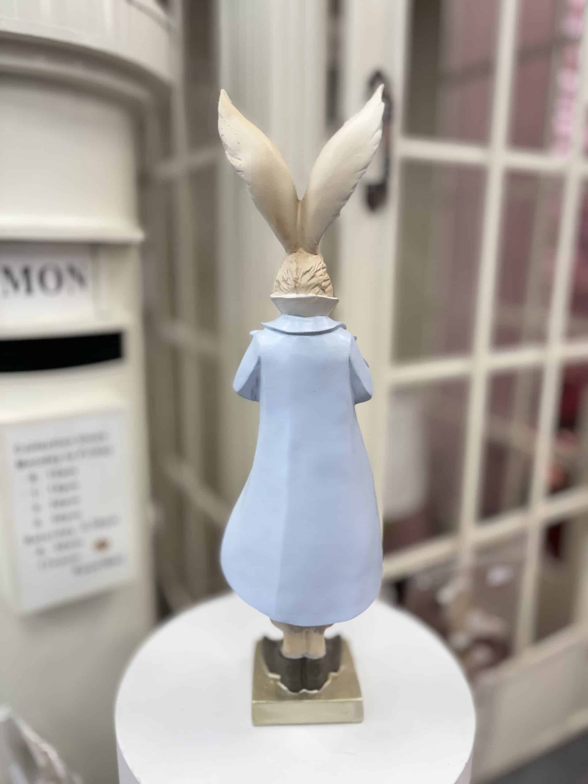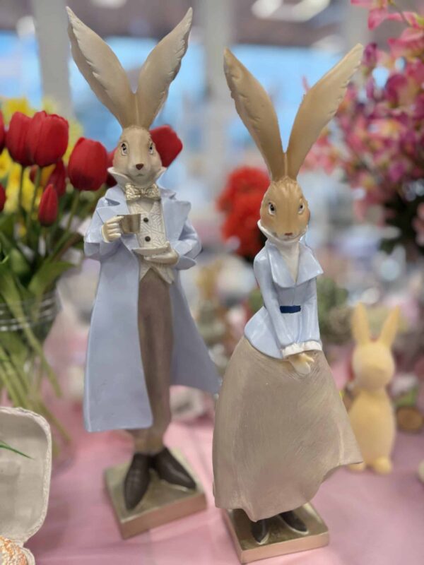 Wykonany z trwałej żywicy i starannie malowany ręcznie, królik w błękitnym płaszczu, białej koszuli i złotej muszce prezentuje się zjawiskowo z każdej strony. Jego dostojna postawa, dopracowane detale i subtelna kolorystyka sprawiają, że będzie idealną ozdobą nie tylko na Wielkanoc, ale i na cały sezon wiosenny – lub po prostu jako stylowy akcent przez cały rok.