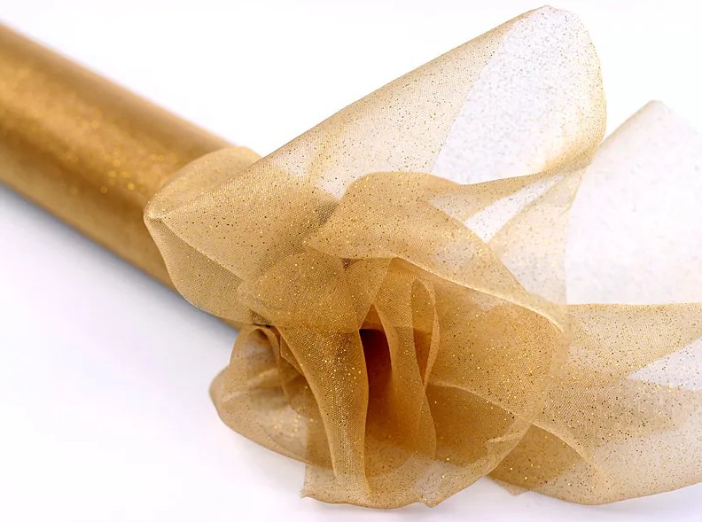 Błyszcząca Organza w kolorze złotym z błyszczącymi mieniącymi się drobinkami.Idealny dodatek dekoracyjny stołu na wszelkie uroczystości.Wymiary: 36 cm x 9m Materiał: 100% Nylon