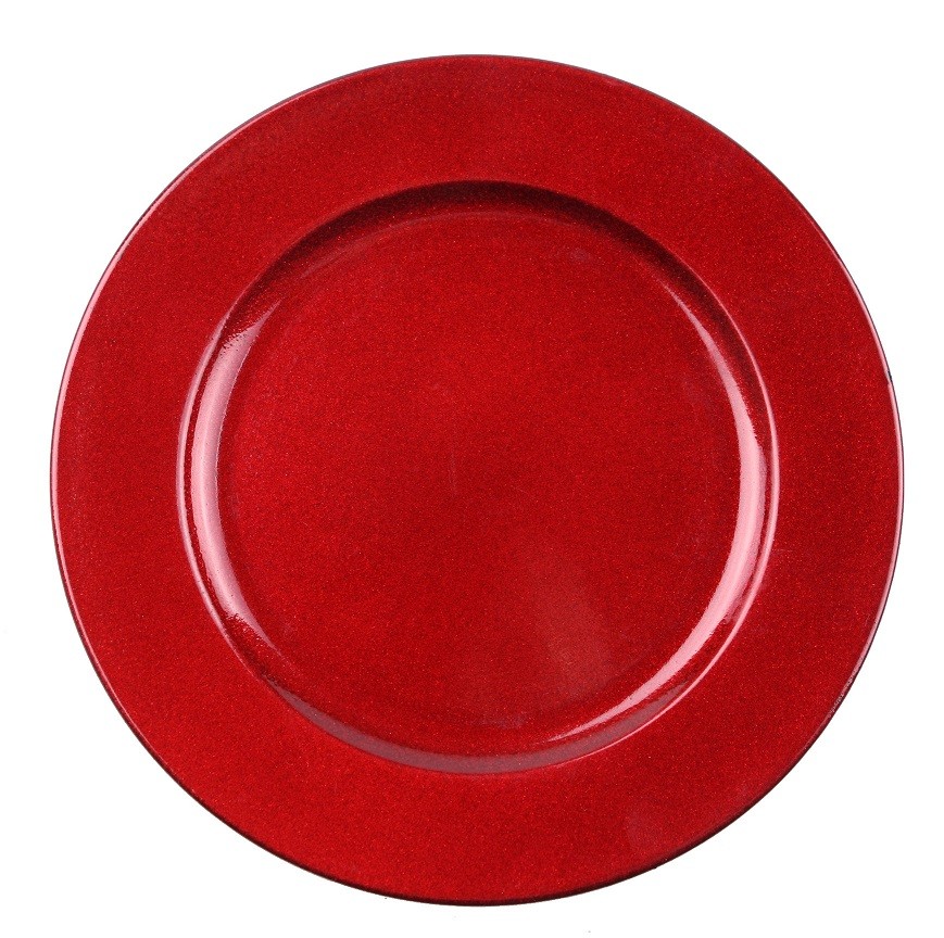 Plastikowy talerz/podtalerz w kolorze czerwonym z brokatem, pięknie się mieniWykorzystywany w szeroko pojętej florystyce, jako baza i podkład pod świąteczne akcenty.Można go także wykorzystać jako podtalerz podczas weselnego przyjęcia.Średnica 20cm.Głębokość około 1cm, średnica głębokości około 14cm.
