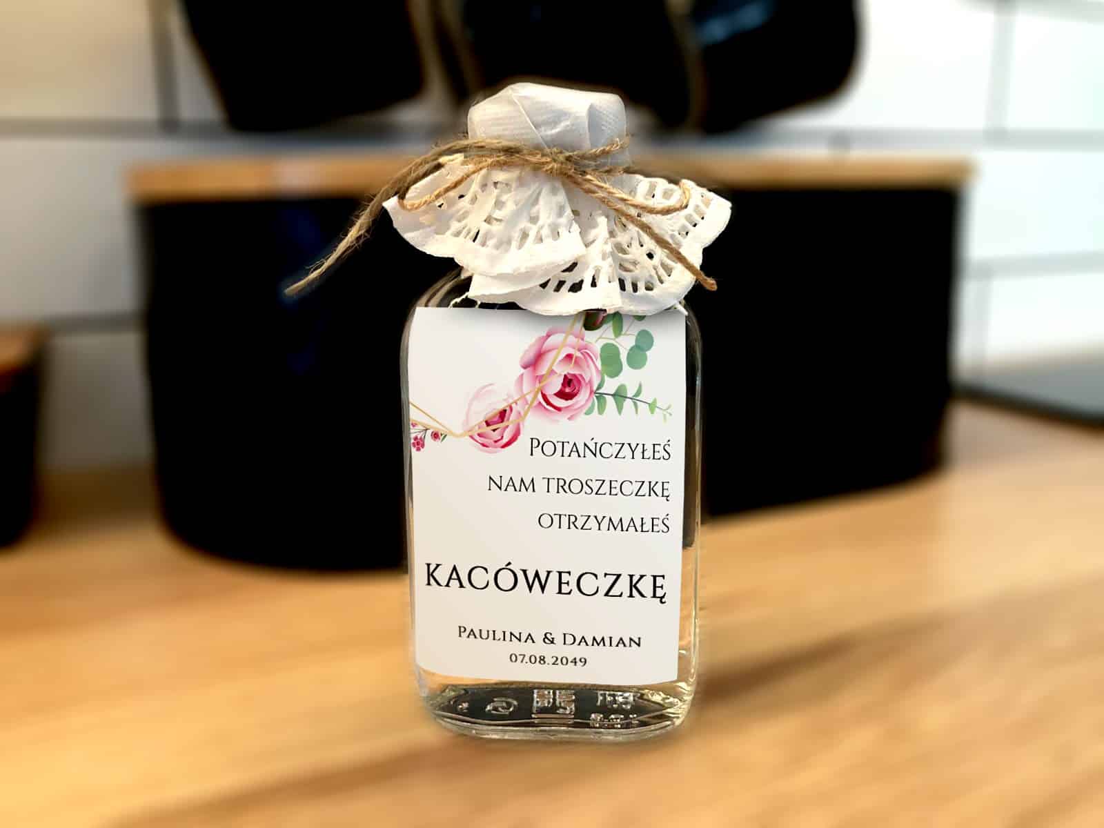 Uwaga! Minimum do wykonania personalizacji np. Paulina & Damian 07.08.2021 r.” wykonujemy przy minimum 20 zakupionych kompletach. Poniższej tej wartości etykiety zawierają napis „Dziękujemy :-)”. Jeżeli chcecie Państwo otrzymać próbkę, bardzo prosimy o napisanie nam o tym.