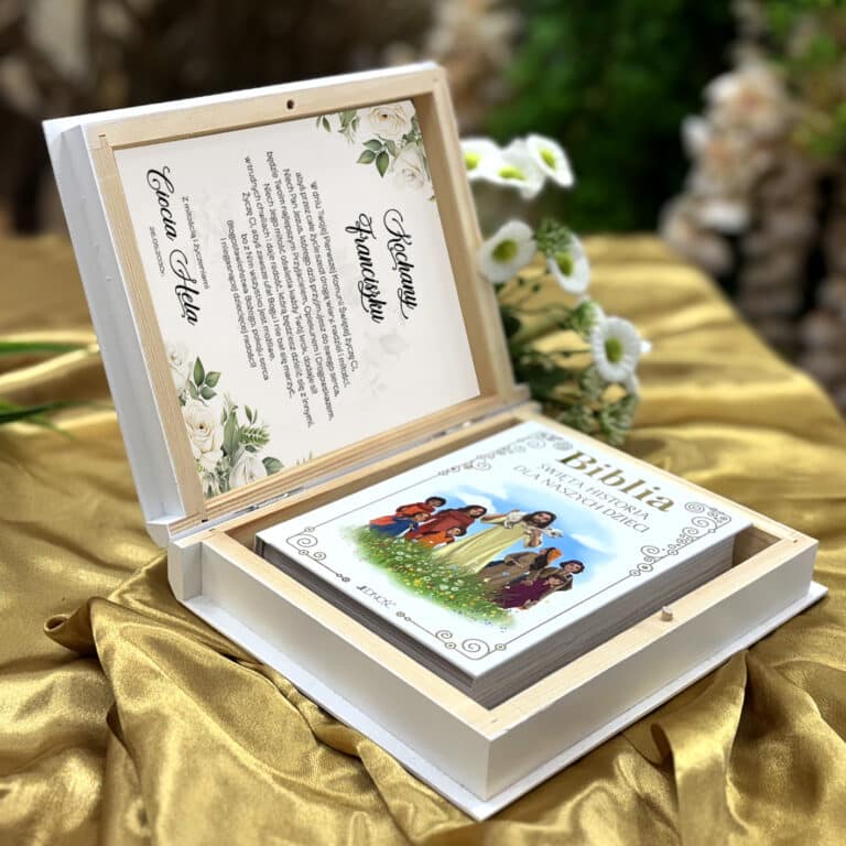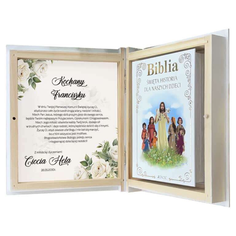 Dedykacja personalizowana – tekst wewnątrz pudełka zostanie dostosowany do wpisanego imienia, jego rodzaju (chłopiec/dziewczynka) oraz liczby (np. dla bliźniąt lub rodzeństwa). Dzięki temu każda Biblia staje się naprawdę wyjątkowym i osobistym prezentem komunijnym.