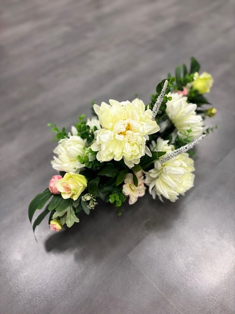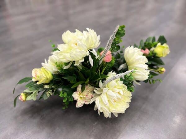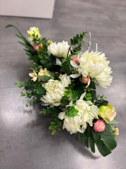 Zastosowanie: Stroik „Kwiatowy Hołd” to idealny wybór na cmentarz, aby wyrazić pamięć i uczucia wobec bliskich. Jego elegancka kompozycja przyciąga wzrok i nadaje nagrobkowi wyjątkowy charakter, stanowiąc piękny wyraz wdzięczności i miłości.