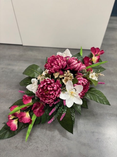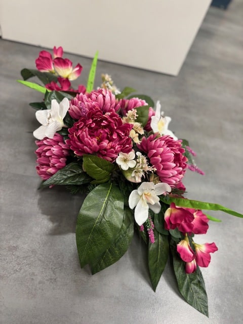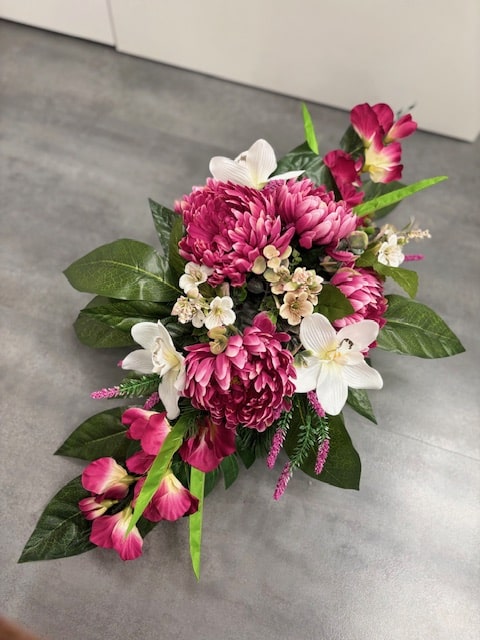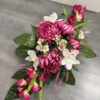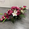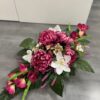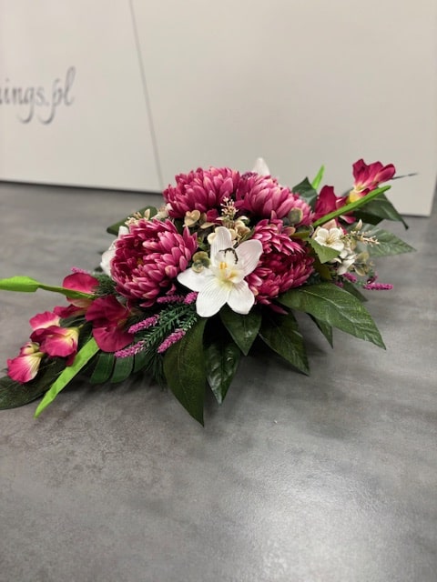 Stroik wykonany został z najwyższej jakości sztucznych kwiatów, co gwarantuje trwałość i estetykę przez wiele miesięcy.