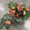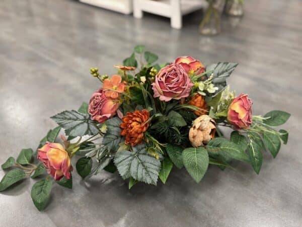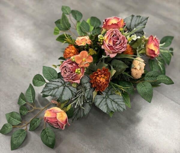 Stroik został starannie zaprojektowany i wykonany z wysokiej jakości sztucznych kwiatów, które zapewniają trwałość i piękno przez długi czas. W kompozycji znalazły się eleganckie, jesienne kolory kwiatów i elementy, które doskonale harmonizują z zielenią liści.
