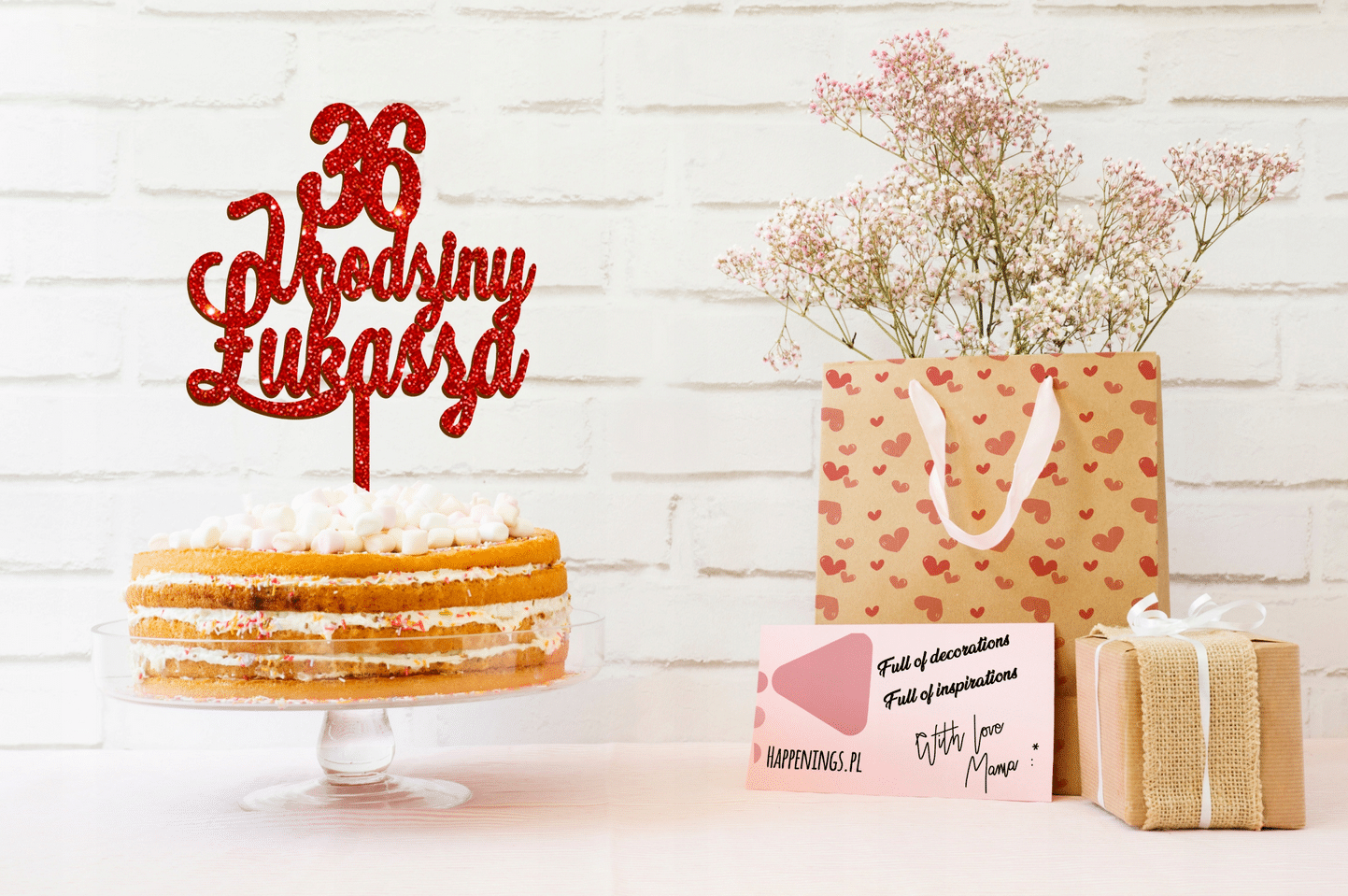 Dzięki możliwości umieszczenia dowolnego napisu topper staje się niepowtarzalnym elementem dekoracji tortu oraz stylową ozdobą stołu. Personalizacja sprawia, że dekoracja idealnie dopasowuje się do konkretnej okazji i osoby.