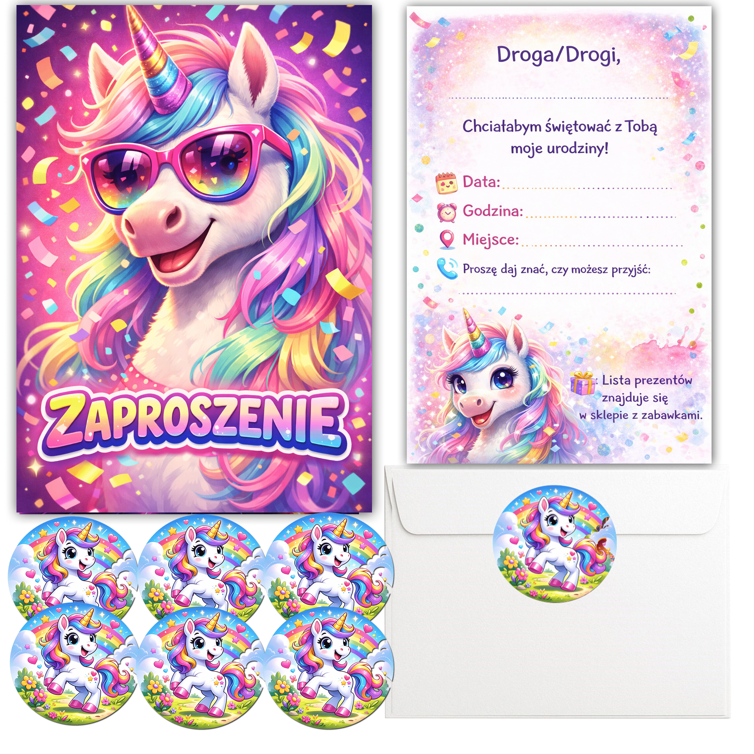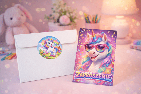 Zaproszenia na urodziny z motywem jednorożca to doskonały sposób, aby zaprosić gości na wyjątkową i pełną kolorów imprezę. Bajkowa grafika z uroczym jednorożcem w modnych okularach nadaje zaproszeniom nowoczesny i radosny charakter.