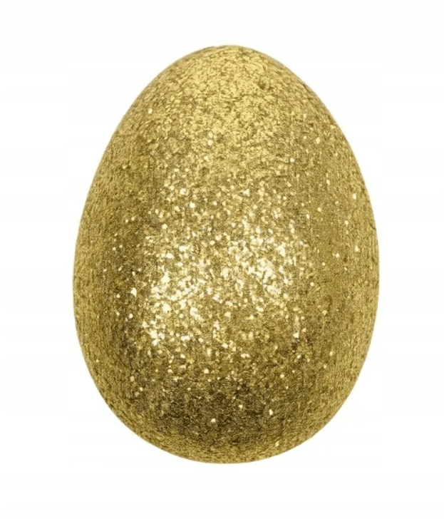 Złote jajko wielkanocne z brokatem to efektowna ozdoba, która przyciąga wzrok i dodaje aranżacjom wyjątkowego blasku. Błyszcząca powierzchnia sprawia, że dekoracja doskonale wpisuje się w eleganckie i nowoczesne wnętrza.