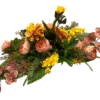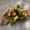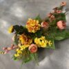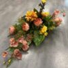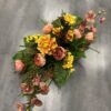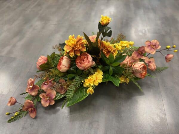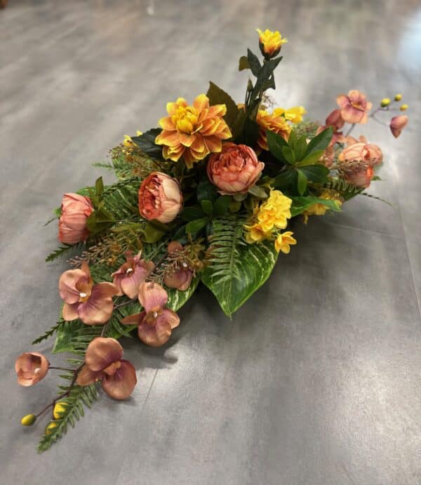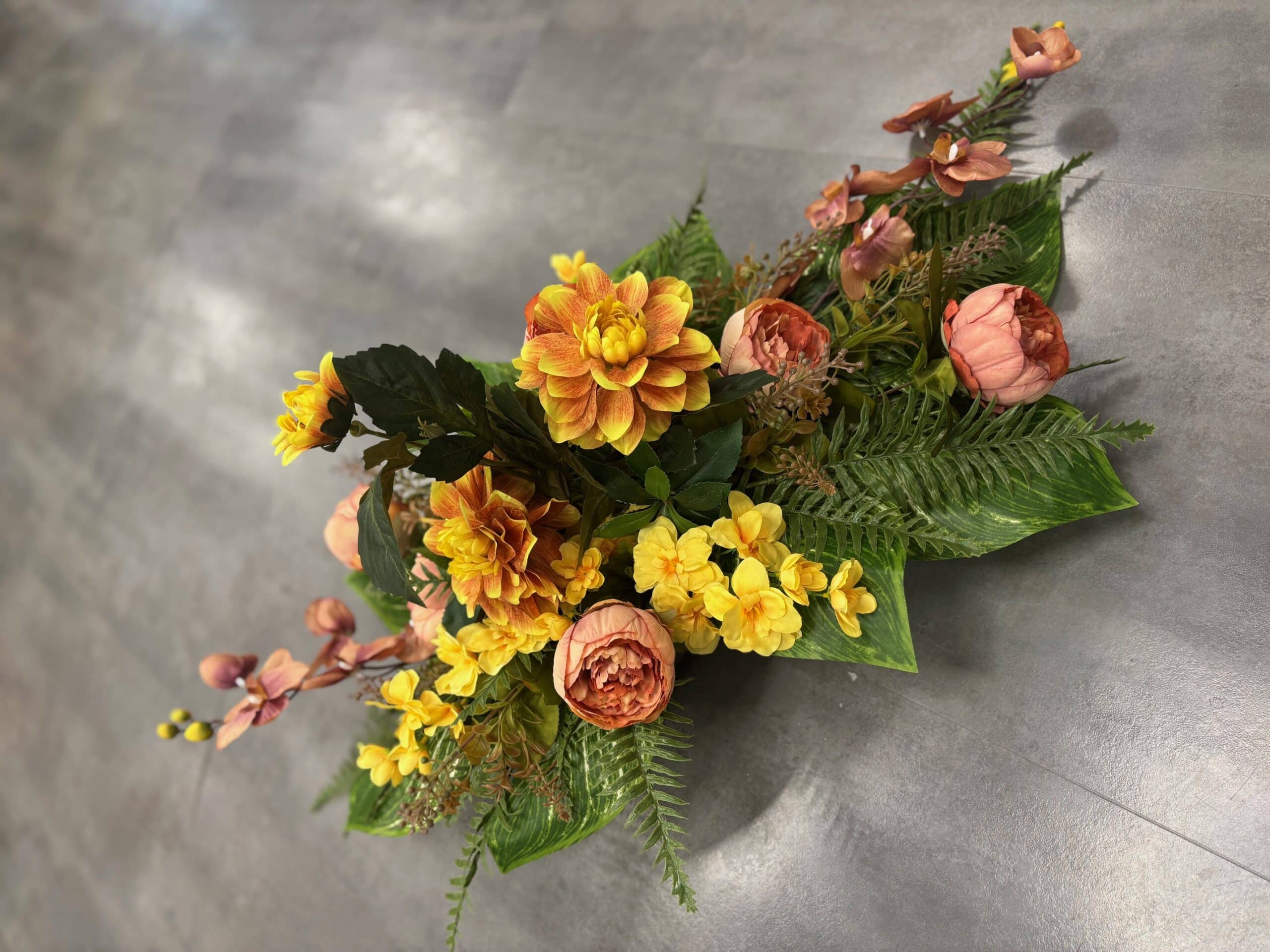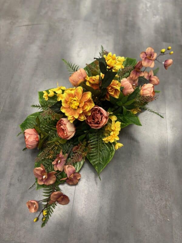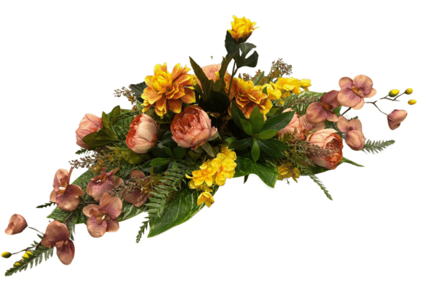 Bogaty, autorski stroik nagrobny, wykonany w 100% ręcznie z najwyższej jakości sztucznych kwiatów. Kompozycja w ciepłych odcieniach żółci, pomarańczu i brzoskwini przyciąga wzrok i pięknie prezentuje się przez cały sezon. To idealna dekoracja na Wszystkich Świętych, rocznice i inne ważne okazje.